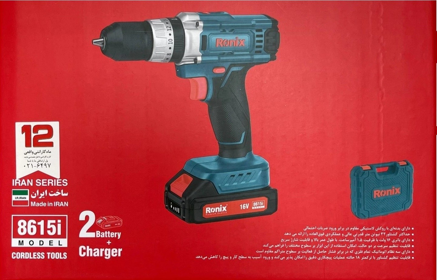دریل پیچگوشتی شارژی رونیکس مدل 8615i یک ابزار به روز شده و قدرتمند در پلتفرم ۱۶ ولت این برند است. حرف “i” در نام مدل، معمولاً نشاندهنده ارتقاءهایی نظیر بهبود کارایی موتور یا طراحی ارگونومیکتر نسبت به مدلهای پایه قبلی (مانند 8615) است. این دستگاه با بهرهگیری از باتریهای لیتیوم-یون ۱۶ ولت، تعادل بسیار خوبی بین قدرت و وزن سبک ایجاد میکند که برای استفاده طولانیمدت خستگی کمتری به کاربر تحمیل مینماید.این مدل مجهز به گیربکس دو سرعته برای مدیریت بهینه گشتاور و سرعت در سوراخکاری و بستن است. ویژگی اتوماتیک به سه نظام اتوماتیک آن اشاره دارد که معمولاً تا ۱۰ میلیمتر ظرفیت دارد و تعویض سریع مته را ممکن میسازد. همچنین، قابلیت تنظیم گشتاور چند مرحلهای (کلاچ) در این دریل، کنترل دقیقی بر نیروی اعمالی فراهم میکند تا از هرز شدن پیچها یا آسیب به سطوح نرم جلوگیری شود.