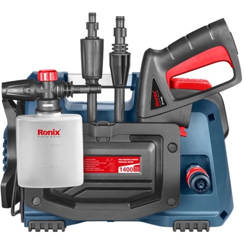 دارای دسته حمل دستگاه دارای شلنگ فشار قوی 5 متری دارای لانس قابل تنظیم مجهز به قرقره ی جمع کننده ی شلنگ به همراه 2 عدد لانس، شلنگ، سوزن تمیز کننده نازل، تفنگ، مخزن مواد شوینده